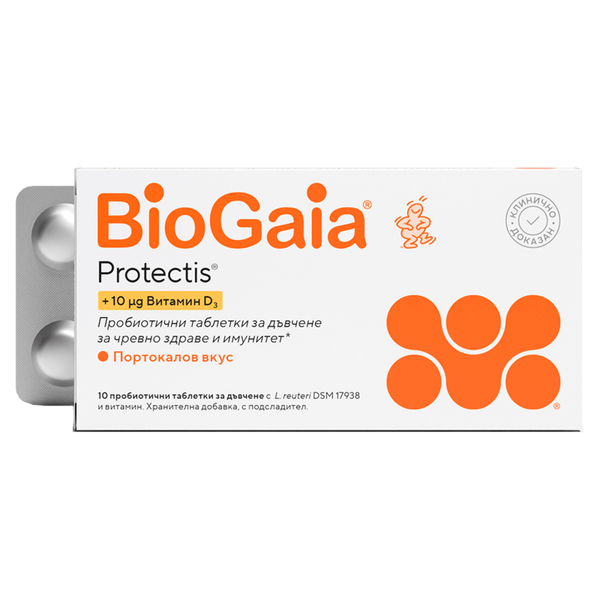 Съдържа комбинация от млечно-кисели бактерии (Limosilactobacillus reuteri Protectis) и Витамин D3. Витамин D е мастно-разтворим витамин и количеството, което получаваме от слънцето зависи от начина ни на живот, възрастта, цвета на кожата, сезона, времето на деня и географското положение. BioGaiа® Vitamin D таблетки за дъвчене имат вкус на портокал и съдържат 10 μg Витамин D3, както и живите бактерии Limosilactobacillus reuteri Protectis. Необходимият прием на Витамин D подпомага нормалната функция на имунната система и нормалната функция на мускулите и костите. При децата Витамин D e необходим за нормалния растеж и развитие на костната система.