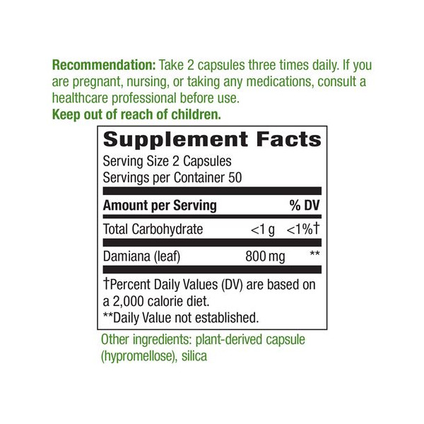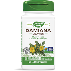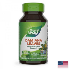 Дамяна (лист) въздейства силно регенериращо на нервната система. Има отпускащ и релаксиращ ефект. Тонизира, насърчава енергията и освежава тялото и ума. Допринася за подобряване на настроението. Тя подпомага сексуалните функции и съдейства за добро настроение. Стимулира организма, поддържа имунните му защити. Билката съдържа арбутин, цианогенен гликозид, смоли, лепкави вещества, кофеин, танини.