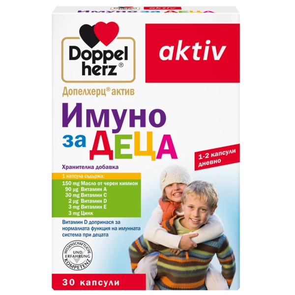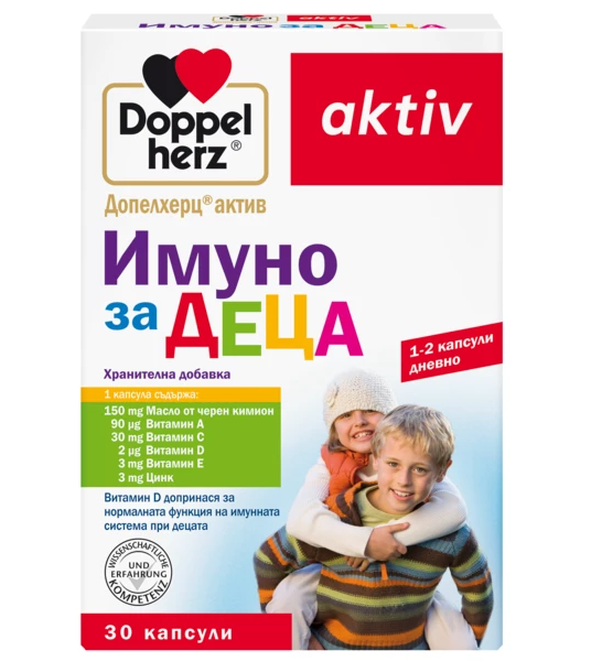 Допелхерц Актив Имуно за Деца е комплексна имуностимулираща формула, създадена да подкрепи детския организъм в периоди на повишени здравни нужди. Маслото от черен кимион предоставя естествени фитонутриенти, а добавените витамини и минерали подпомагат имунната система, костния растеж, зрението и клетъчната защита. Формулата е подходяща за ежедневен прием при деца, които боледуват често, посещават детска градина или имат недостатъчен прием на витамини.