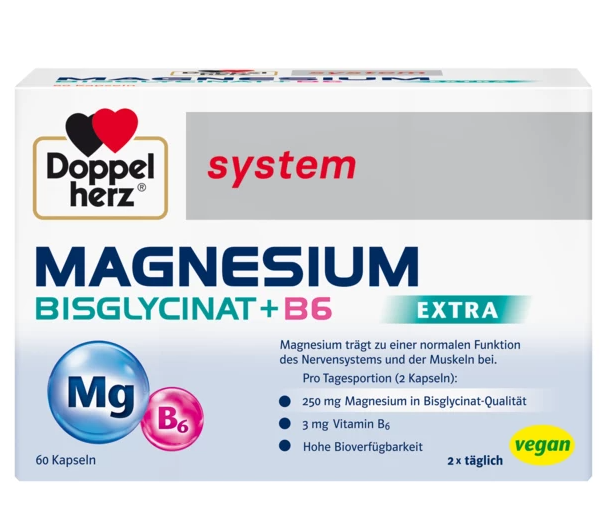 Допелхерц Систем Магнезий Бисглицинат + B6 предлага високоусвоима форма на магнезий, подходяща за поддържане на нормалната функция на мускулите, нервната система и енергийния метаболизъм. Магнезиевият бисглицинат е органична хелатна форма, която се абсорбира оптимално и е щадяща за храносмилателната система. Витамин B6 допринася за образуването на червени кръвни клетки, метаболизма на протеини и нормалната хормонална активност.