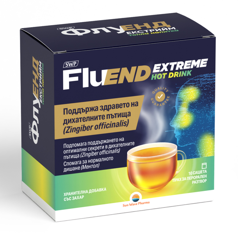 FluEnd Extreme Hot Drink от Сън Уейв Фарма е хранителна добавка под формата на разтворим прах за приготвяне на топла напитка, създадена за подпомагане на дихателните пътища и облекчаване на дискомфорта в гърлото. Формулата комбинира растителни екстракти и витамин C, които подпомагат естествените защитни сили на организма по време на сезонни неразположения.