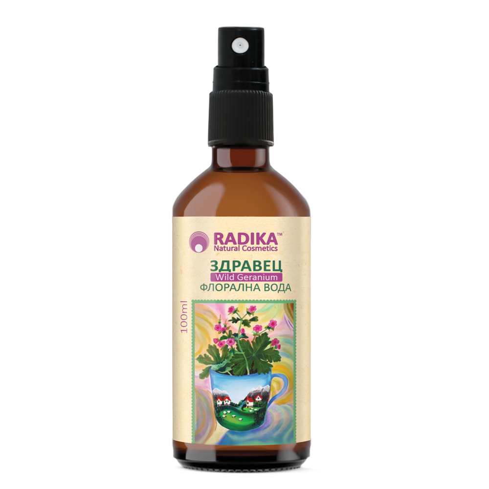 Флоралната вода от здравец Радика е чист натурален продукт, получен чрез дестилация на свежи листа от див български здравец. Хидрозолът действа тонизиращо и почистващо, като същевременно поддържа естествената хидратация на кожата. Успокоява чувствителната кожа и спомага за намаляване на зачервяванията. Формулата е подходяща за ежедневна грижа при мазна и комбинирана кожа. Може да се използва и за освежаване и балансиране на скалпа.
