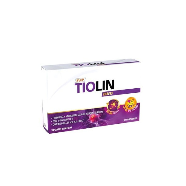 Тиолин Дуо е хранителна добавка, предназначена да спомогне за нормалното функциониране на централната и периферната нервна система. Със съдържанието на двойно количество алфа-липоева киселина и уридин, тя предлага интензивна подкрепа за възстановяването и стабилната работа на нервите и нервната система. Защитава клетките от оксидативен стрес, играе важна роля в регулирането на въглехидратния метаболизъм и подкрепя енергийния обмен в клетките.
