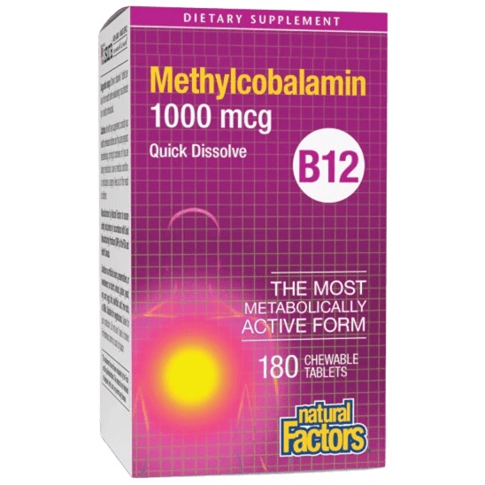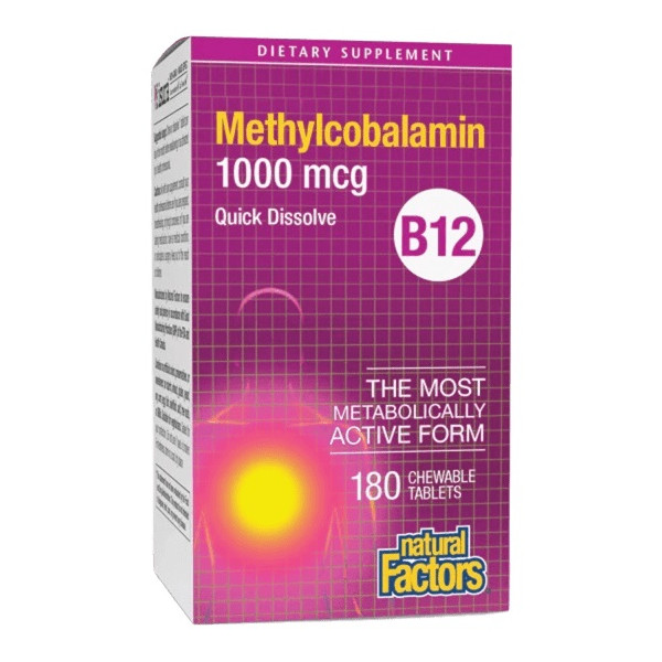 Витамин B12 (метилкобаламин) на Natural Factors е висококачествена формула за поддържане на нервната система, енергийния метаболизъм и сърдечно-съдовото здраве.